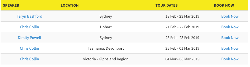 For a complete list and a link for booking, check out all the up-to-date details on our Touring Speakers page